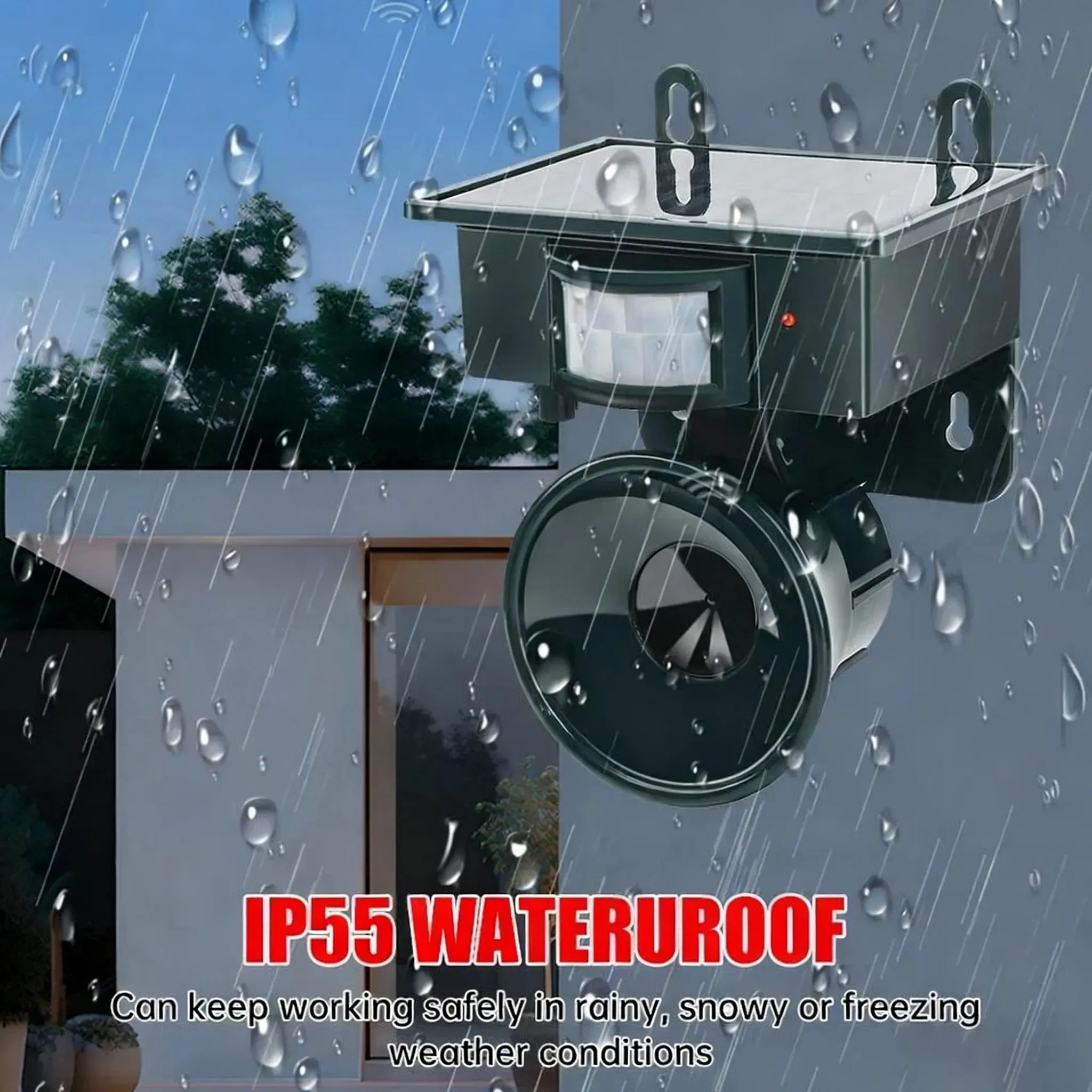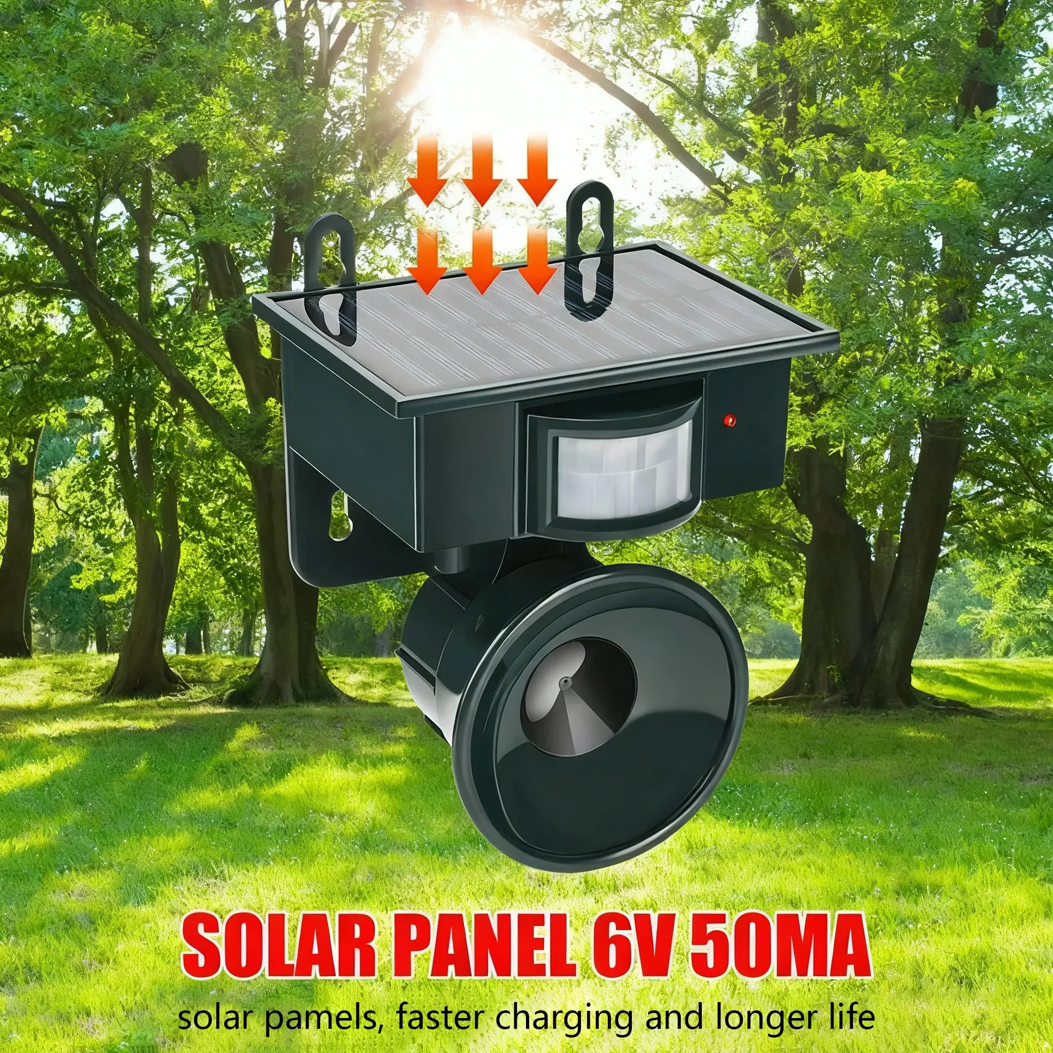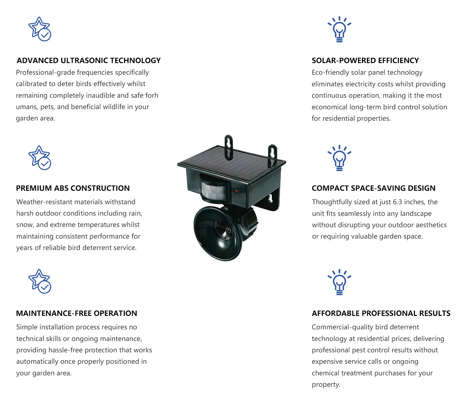 - Ultrasonic & Motion-Sensing Technology — 180° motion sensing, effectively repels birds, safe and eco-friendly.