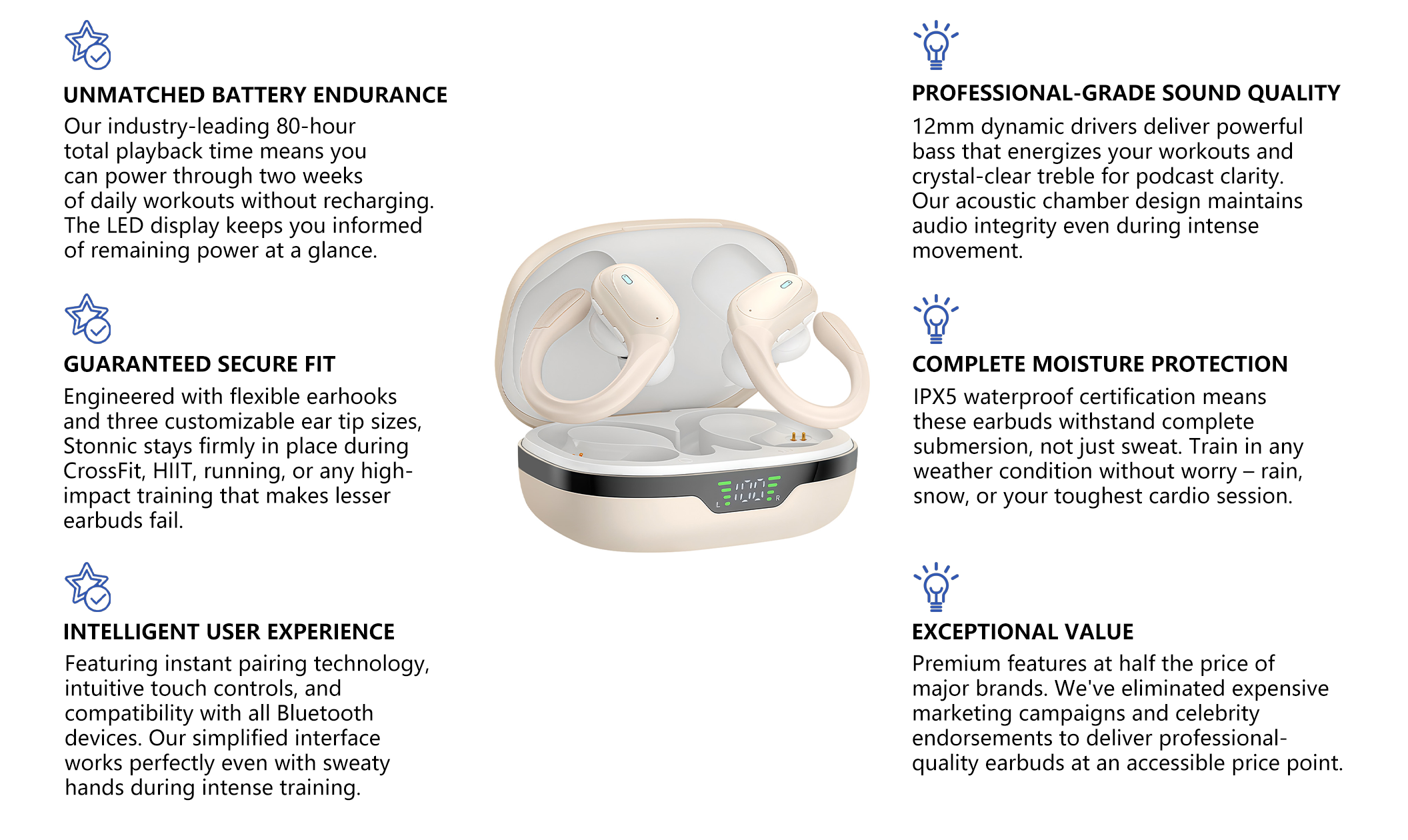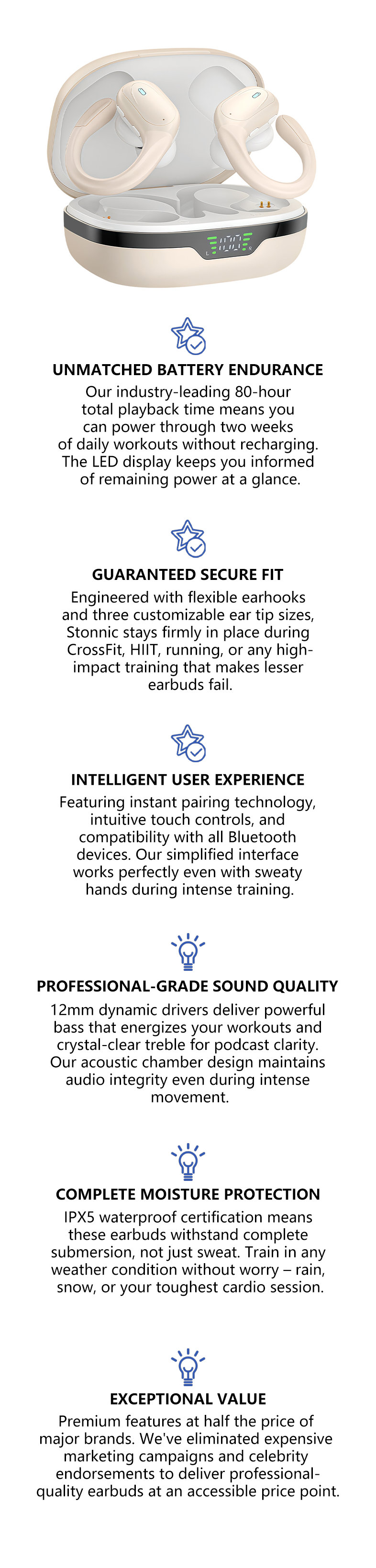 Stonnic wireless earbuds combine cutting-edge audio technology with fitness-focused design, creating the ultimate workout companion for athletes at every level. Our specialized construction prioritizes stability, comfort, and durability in high-movement environments.
